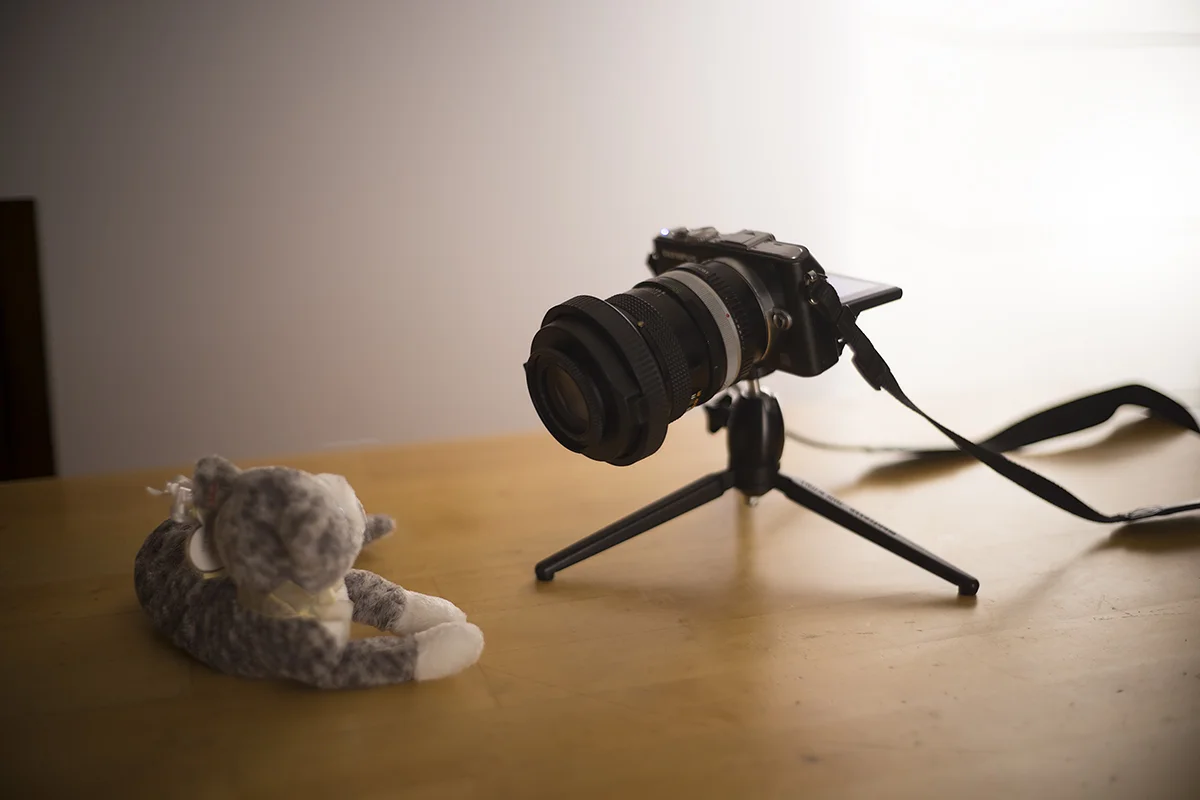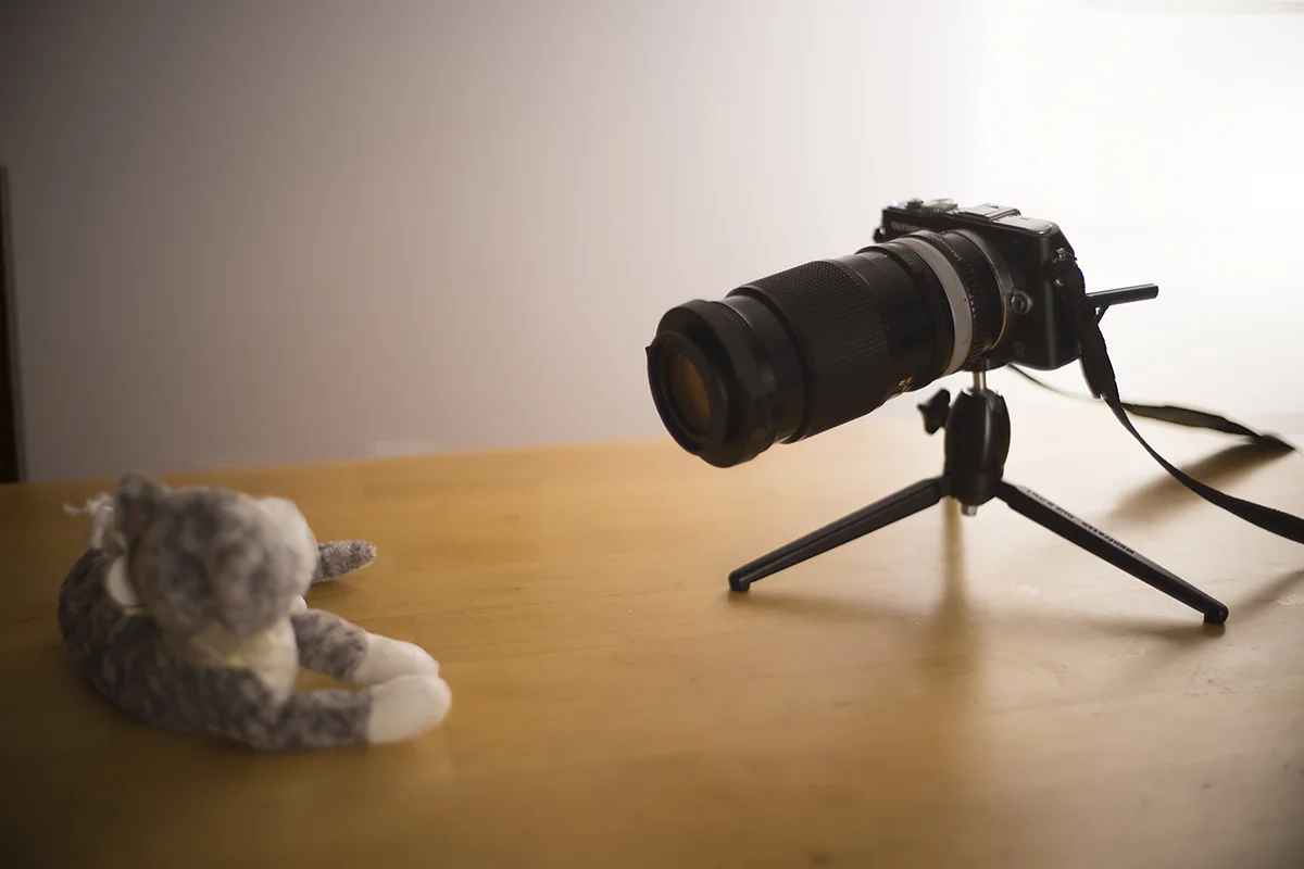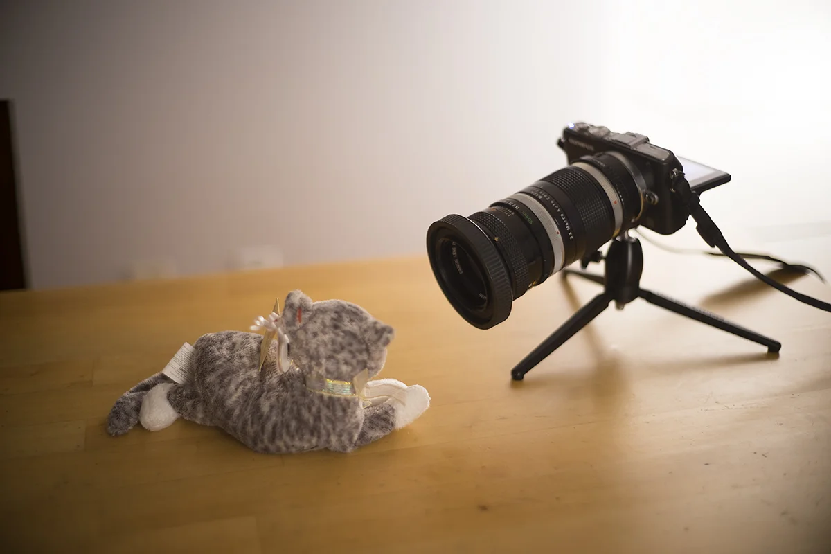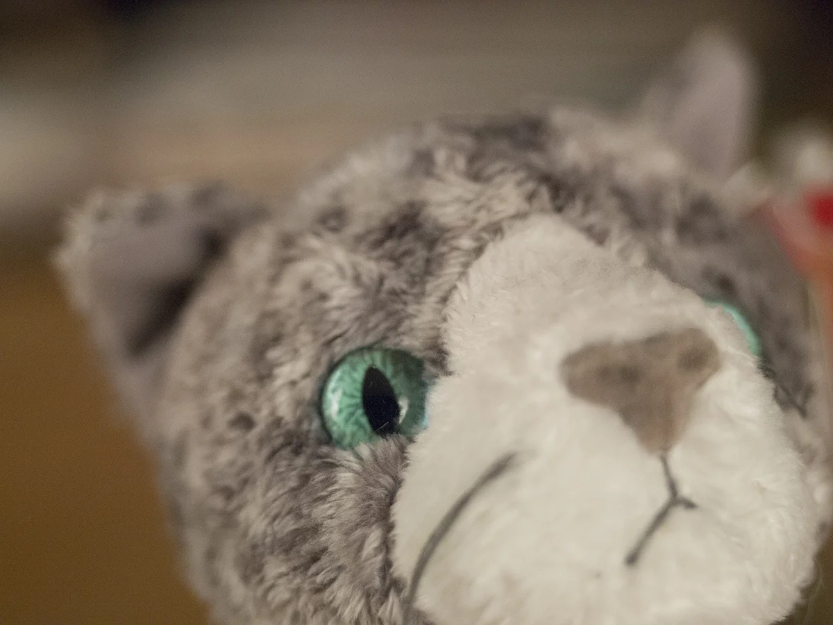 Let’s see the effect it has on three Canon FD lenses: a 135mm f/2.5, a 50mm f/1.4, and a 28mm f/2.8. I’ll use this stuffed cat to demonstrate.