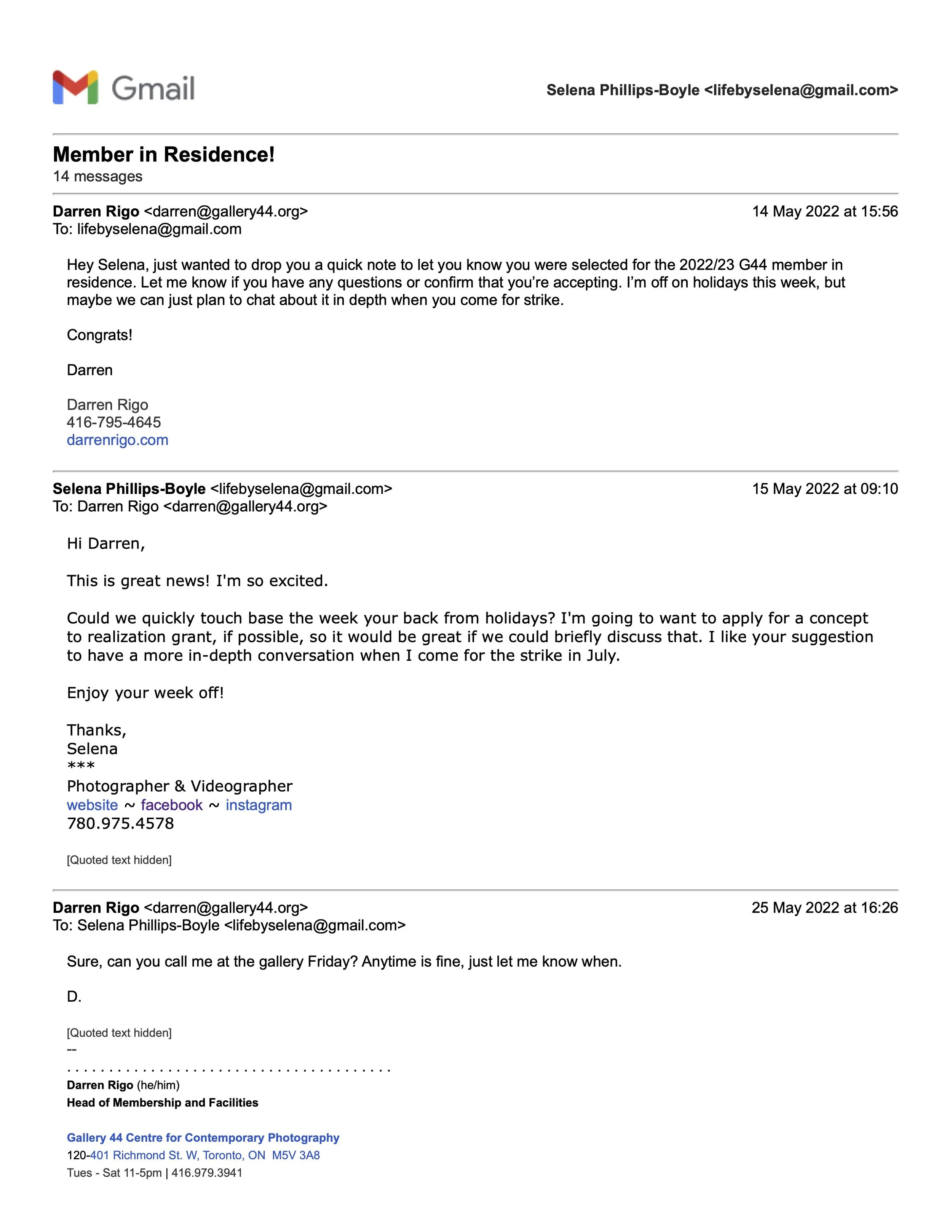 2) J’étais dehors, sur une rue bourdonnante d’activité. Je venais de terminer les dernières images d’une commande après deux longues semaines de tournage. En consultant mes courriels, je suis tombé·e sur la lettre d’acceptation du centre Gallery 44. Après tellement de demandes rejetées, j’avais enfin décroché une résidence. J’en ai pleuré de joie.