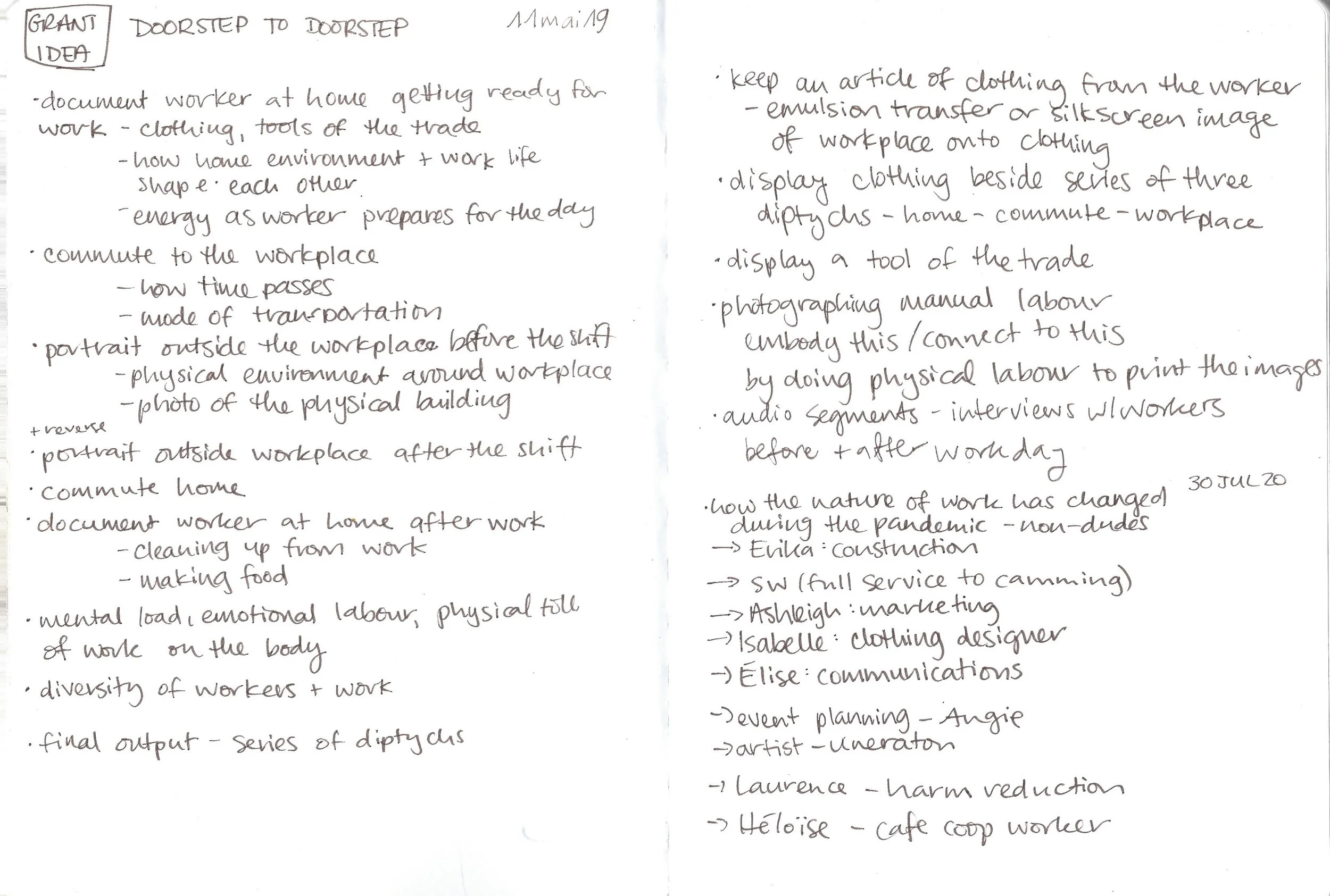 1) Without institutional support, it's difficult to enter workplaces to document workers. I developed the concept of "Doorstep to Doorstep" as a creative way to get around this obstacle. The original idea was developed in 2019, showing the life cycle of concept development to presentation.
