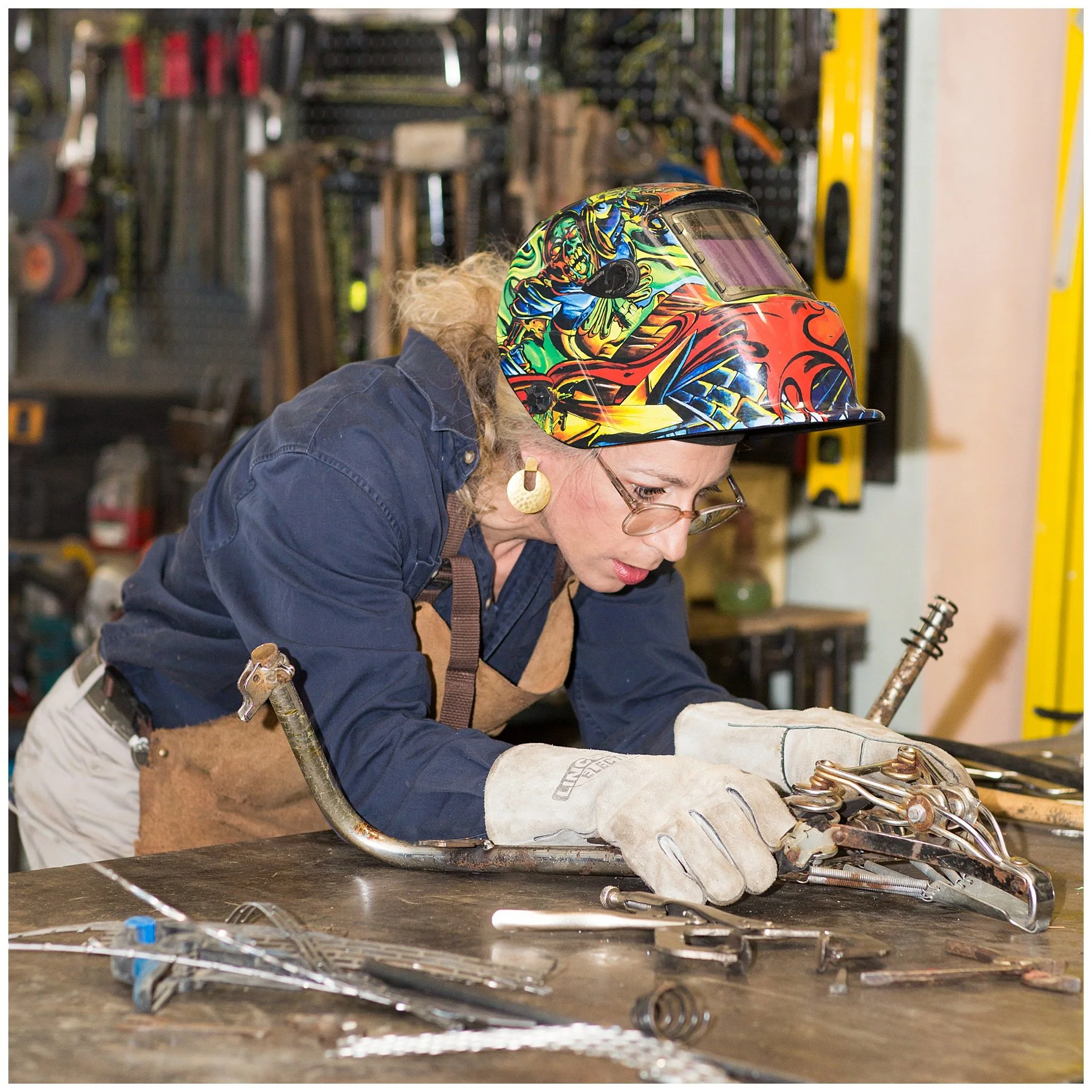 Salvageable. In a way it's a beautiful parallel to the artistic process Margot uses in her work. Discarded bike seats transform into animal heads, metal handlebars into antlers, old bolts and coils into eyes. Margot is a punk artist and sculpturist based in Tio'tia:ke (Montreal). “Artists in Studio” is an ongoing portraits project of Selena Phillips-Boyle.